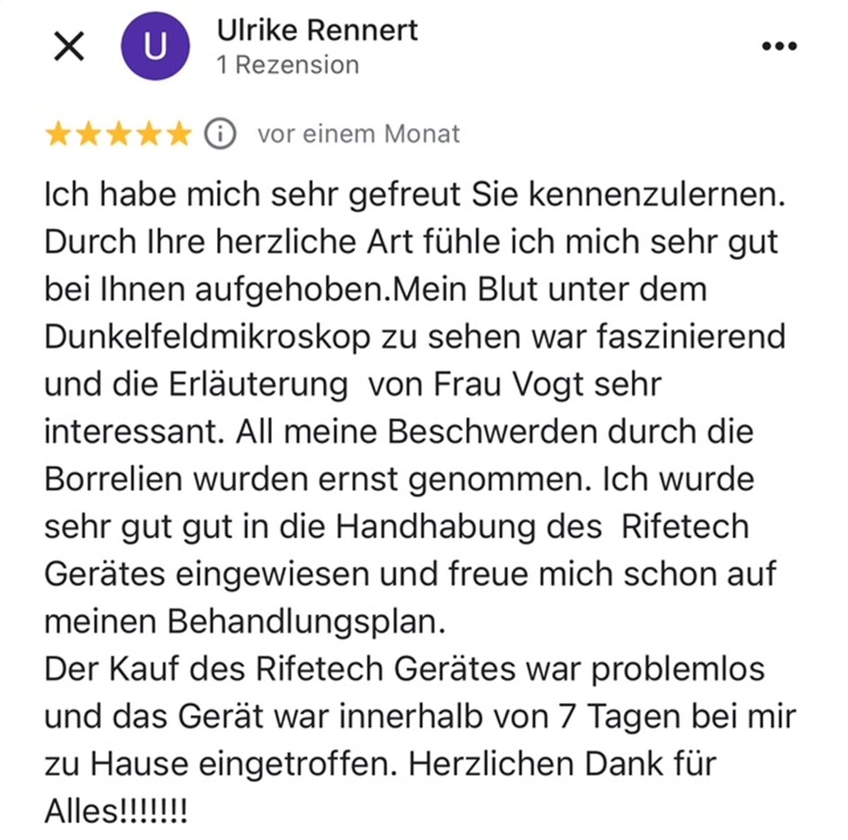 Die Beratung beim Kauf des RIFETECH® Plasma Gerätes und speziell die Einweisung in das Therapie Gerät benötigt viel Erfahrung. Dies bringt unsere Kooperation mit der Naturheilpraxis Anja Vogt mit, die seit Jahren mehrere RIFETECH® Plasma Gerät in ihrer Praxis für unterschiedlichste Krankheitsbilder erfolgreich einsetzt. Die vielen ausnahmslos 5 Sterne Bewertungen unserer Kunden zeugen von unserer Kompetenz, unserem Engagement und der Zufriedenheit unserer Kunden mit unserer Betreuung. Für aktuelle Bewertungen verweisen wir auf unser Google Maps Profil.